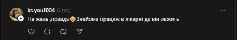 Піар-менеджерка артиста Ірена у відповідь на запит журналістів з 24 каналу подякувала всім за підтримку, але відмовилася розкривати деталі про стан здоров’я співака.