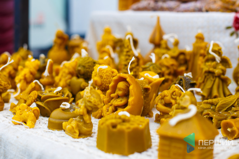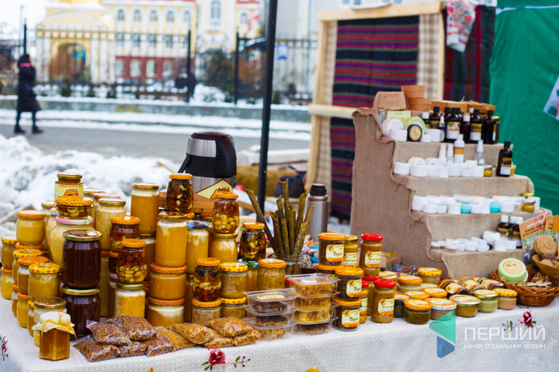 Дехто з учасників облаштував біля своїх хатинок столи з наїдками, які продають. Також на Театральному майдані можна купити бджолопродукти.