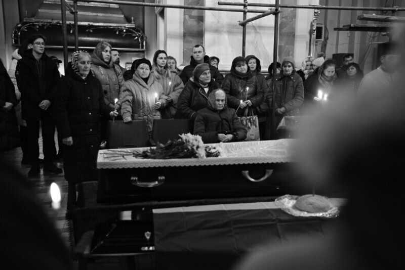 Після завершення богослужіння труну з тілом покійного захисника пронесли Театральним майданом. Біля пам’ятного фотостенда загиблим Героям присутні зупинилися і виконали Державний Гімн України.
