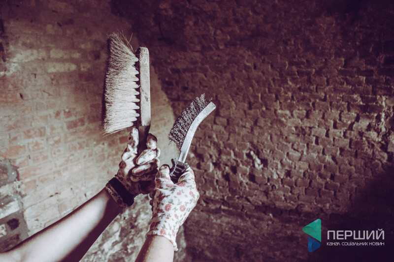 Потроху з-під щіток відкривається цегла склепіння. І це направду цікаво, якщо знати, що ці стіни будували у 17 столітті.