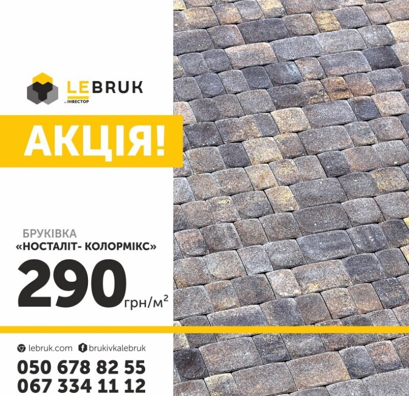 Луцький виробник бруківки LeBruk за акційною ціною продає бруківку марки «Носталіт колормікс». Це бруківка, призначена для вкладання на пішохідних зонах: паркових доріжках, скверах, прибудинкових територіях.