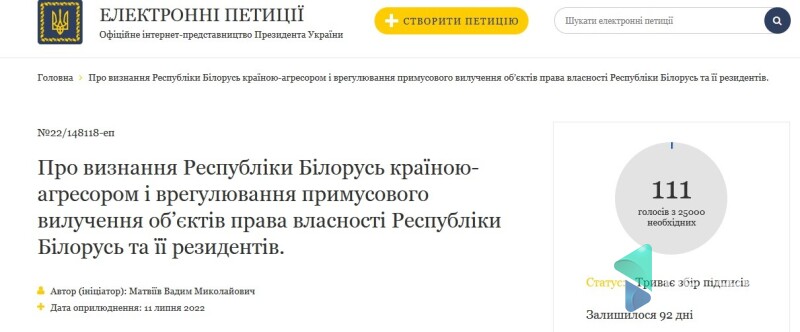 Петиція «Про визнання Республіки Білорусь країною-агресором і врегулювання примусового вилучення об’єктів права власності Республіки Білорусь та її резидентів» 11 липня оприлюднена на веб-сайті офіційного інтернет-представництва президента України.
