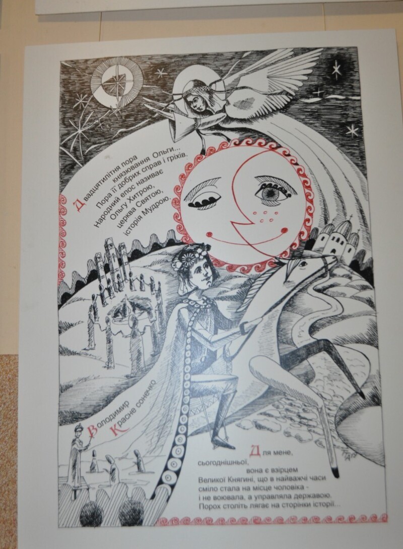 На виставці представлена 21 робота, і всі вони складаються у цілісну історію, яка передає найважливіші події з життя княгині Ольги, – пише «Слово правди».