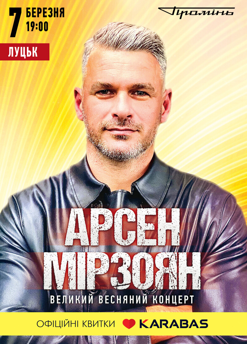 Луцьк зустріне весну з Арсеном Мірзояном! 7 березня не пропустіть вражаючий концерт. Приголомшливе світлове шоу, нова весняна концертна програма з усіма улюбленими піснями та величезною порцією драйву й найкращого настрою!