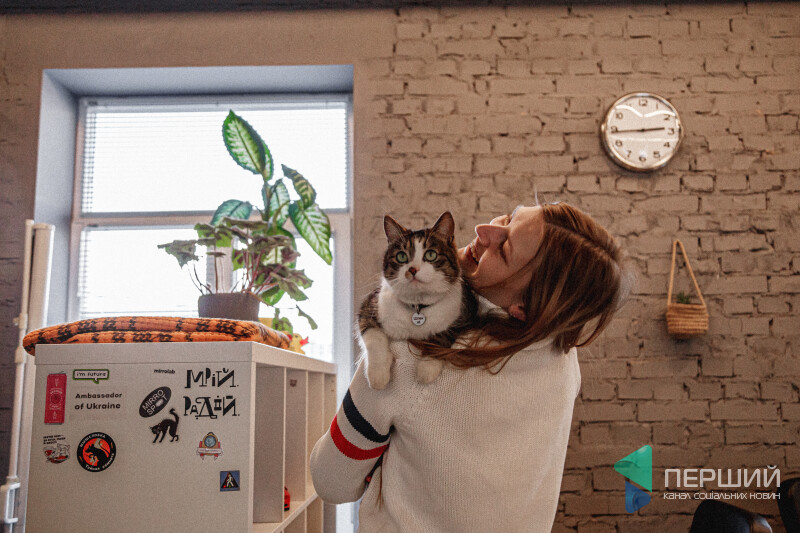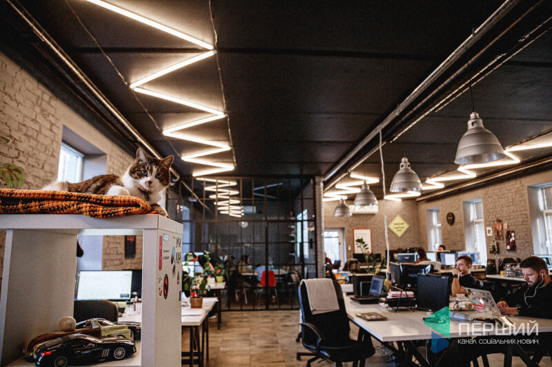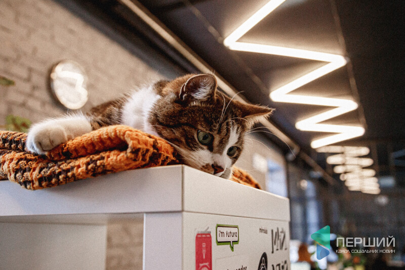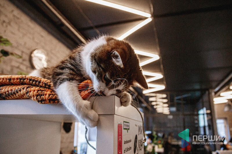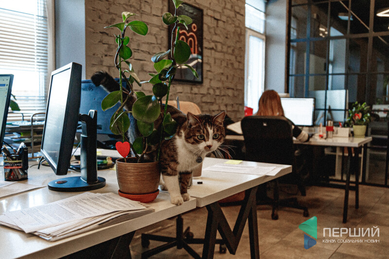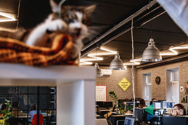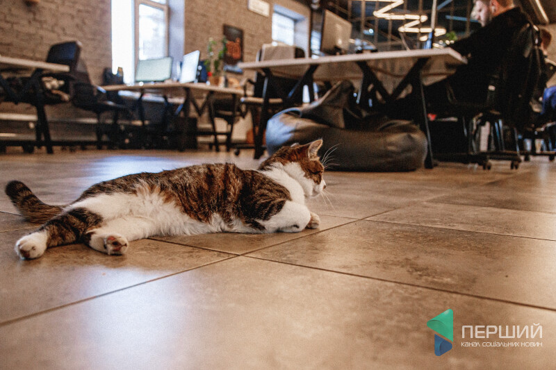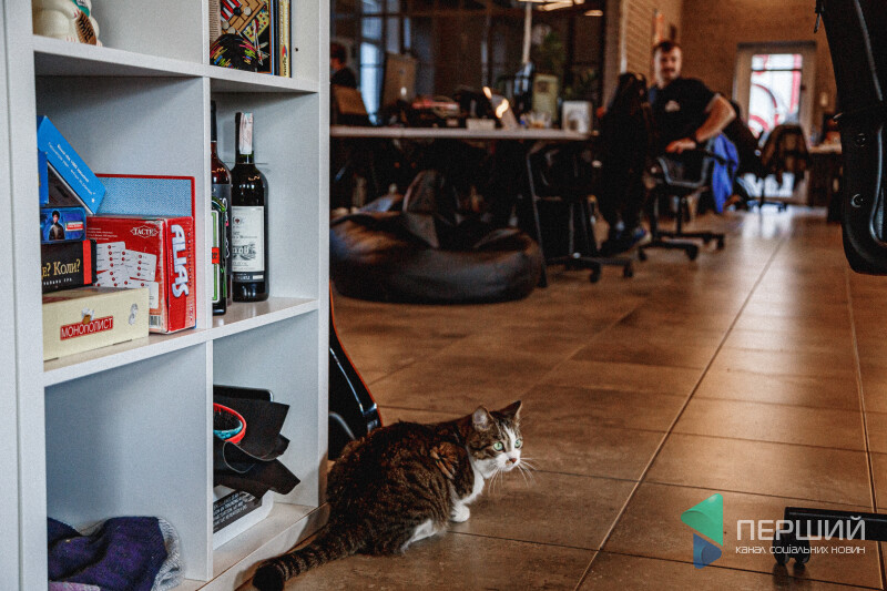 Від офісної атмосфери Шпек не стресує. Тут він органічно вписується у креативний інтер’єр. Запросто може ходити по столах, переступати через ноутбуки, ховатися за вазонами чи просто мирно спати на пледі на полиці.
