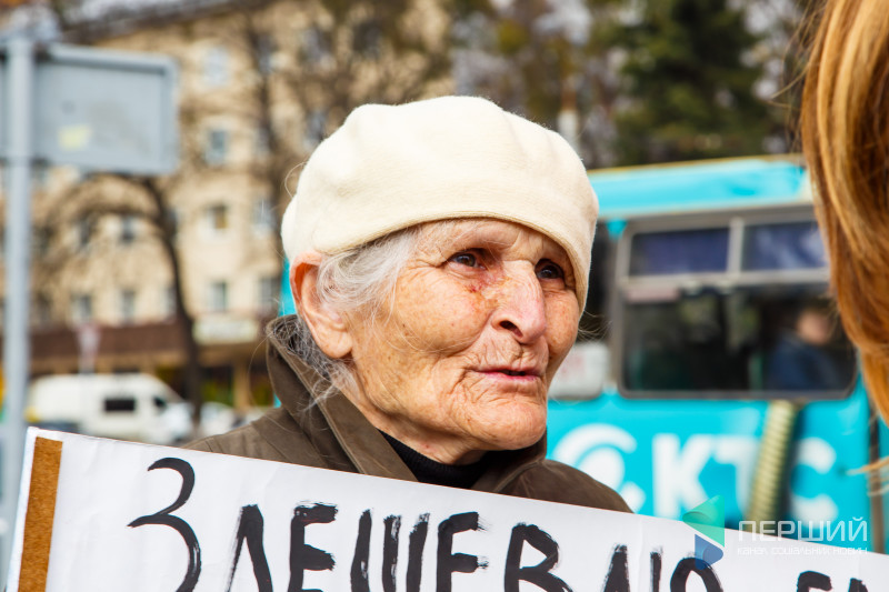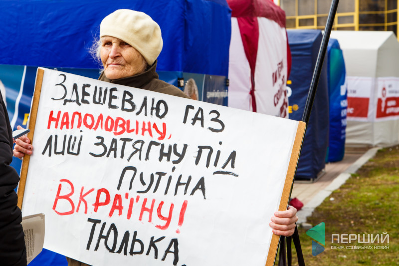 Людмила Філіпович. Їй 79. На плакаті у неї: «Здешевлю газ наполовину, лиш затягну під Путіна Вкраїну. Тюлька». Розповідає, що з 90-го року ходить на мітинги. І «ще під обкомом стояла за Україну».