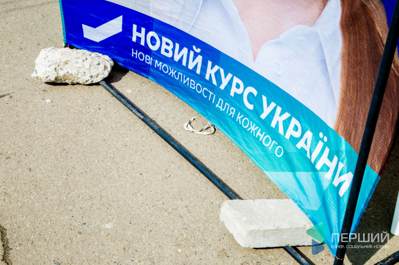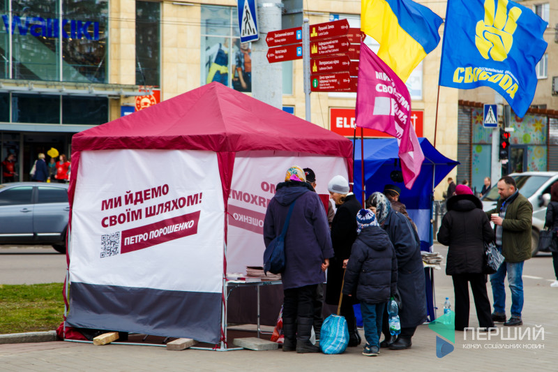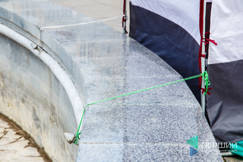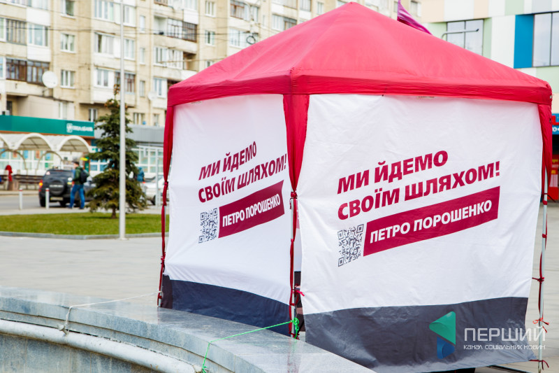 За кілька хвилин, перебравшись на іншу площу, ми робимо другу спробу таки розговорити порошенківців. Білий намет із символікою діючого Президента міцно прив’язали мотузками до фонтану навпроти РЦ «Промінь».