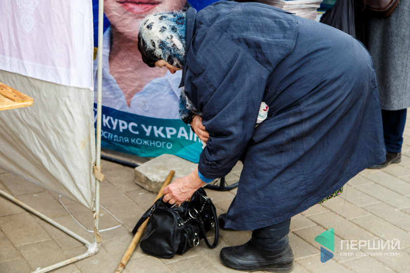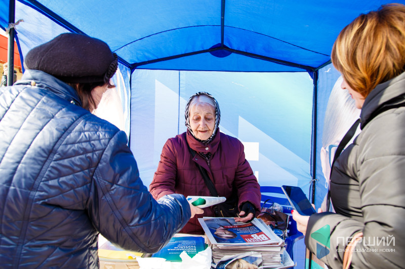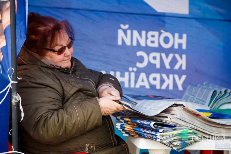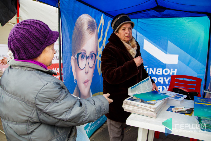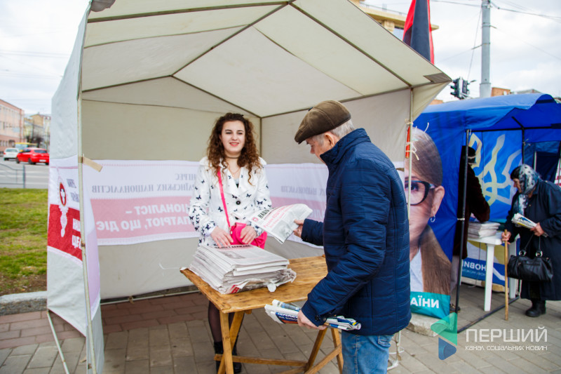 Євгенія Дружиніна роздає газети з Кошулинським. Ні на мить не задумується, чи варто їй про себе розповідати. Не ховається. Не соромиться. Лучанка. Сивина вибивається з-під шапки. У партії 8,5 року.