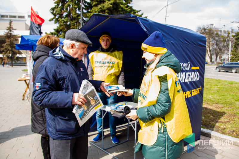 Нарешті оговталися в наметі Гриценка. Назар Шумчук хутенько вдягає до болю жовтий фартушок у символіці Анатолія Степановича. Йому 28. Працює у Луцьку інженером із програмного забезпечення. «На прохання друзів» стоїть у наметі. Це все, каже, «в основному на волонтерських засадах». Робота така йому не нова, вже працював на виборах в студентські роки, «коли ще Палиця кудись ішов».