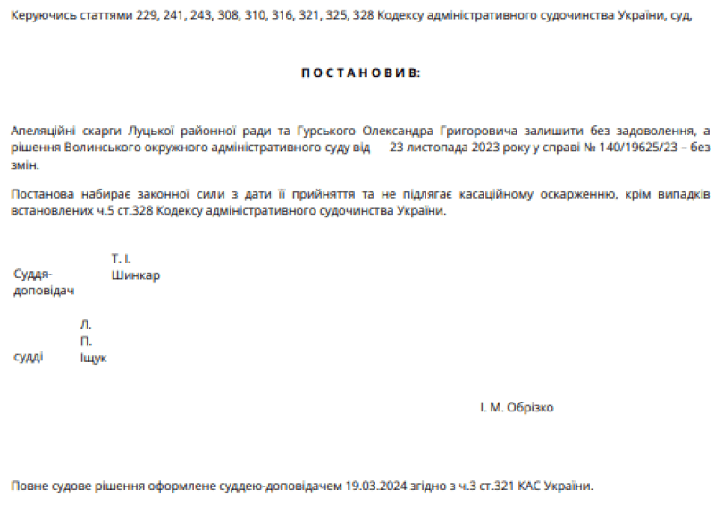 Нагадаємо, 23 листопада 2023 року Волинський окружний адміністративний суд визнав протиправним обрання голови Луцької районної ради Олександра Гурського, скасувавши рішення депутатів.