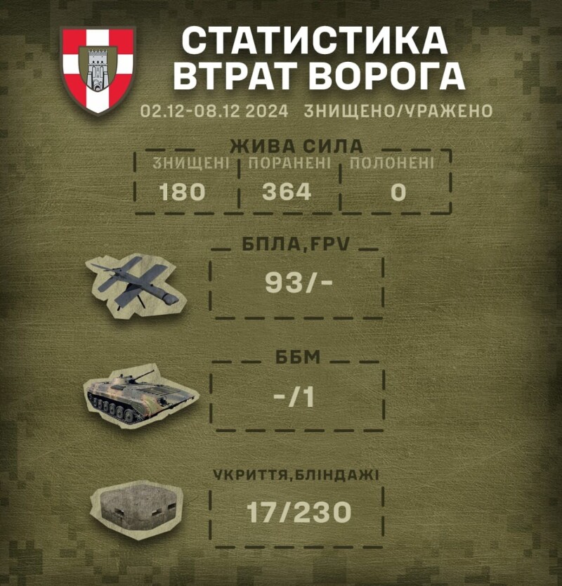 Статистику втрат, завданих ворогу бійцями 100 ОМБР, з 2 по 8 грудня 2024 року опублікували на фейсбук-сторінці бригади.