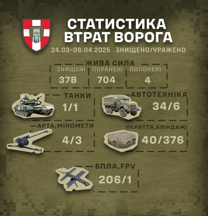 Підрозділи «Сталевої Сотки» продовжують успішно виконувати бойові завдання, завдаючи відчутних втрат російським окупантам. За період з 24 березня по 6 квітня 2025 року воїни бригади знищили та уразили значну кількість живої сили та техніки противника.