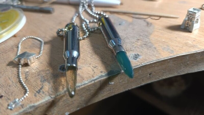 Серед незвичних прикрас ювеліра — кулони, що зроблені зі справжніх гільз. Зі слів Тараса Янюка, їх йому передали українські військовослужбовці безпосередньо із передової.