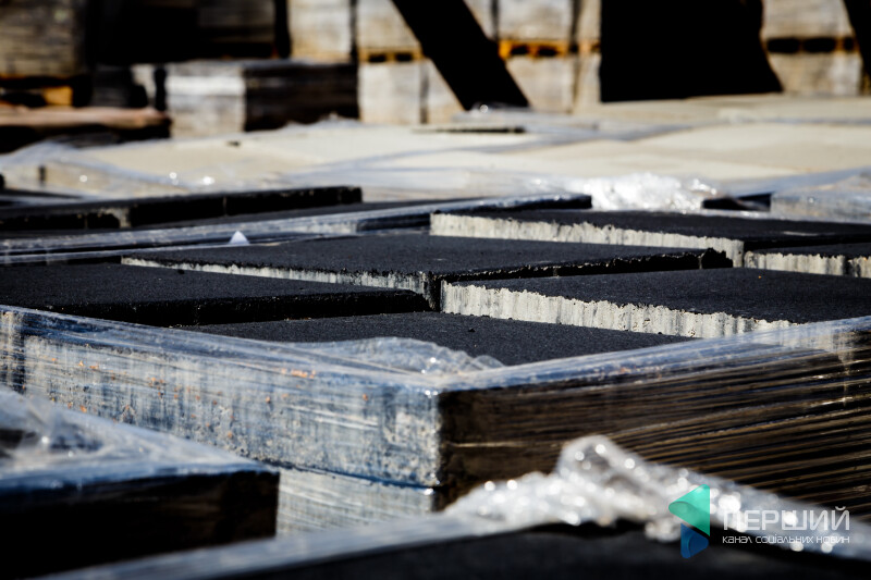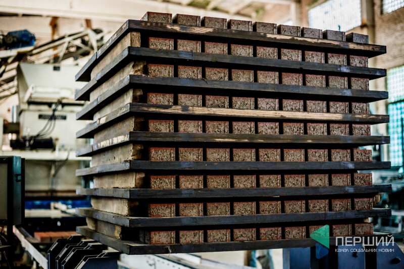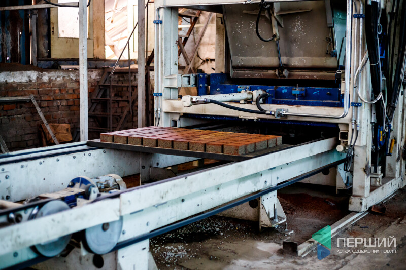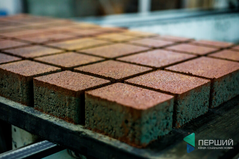 Бруківка народжується… голосно. Шумить конвеєр. Гігантські «міксери» перемішують розчин. Раз у кілька хвилин в цеху усе заглушує вібруюче «дррррррр» – це, власне, «роди»: з-під пресу з’являється конвеєр з рядами акуратних однакових «пиріжків».