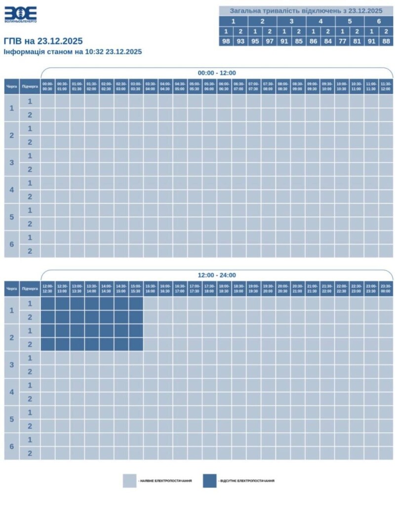 Через масований обстріл в ніч на 23 грудня частина Луцька лишилася без світла й води. «Волиньобленерго» оприлюднили графіки вимкнень. Поки вони стосуються лише двох черг.