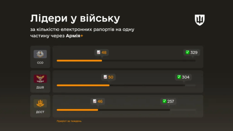 Найбільшу кількість рапортів на частину обробили у Силах спеціальних операцій (ССО), Десантно-штурмових військах (ДШВ) та Державній спецслужбі транспорту (ДССТ). В середньому кожна з їхніх інтегрованих частин обробила таку кількість запитів: