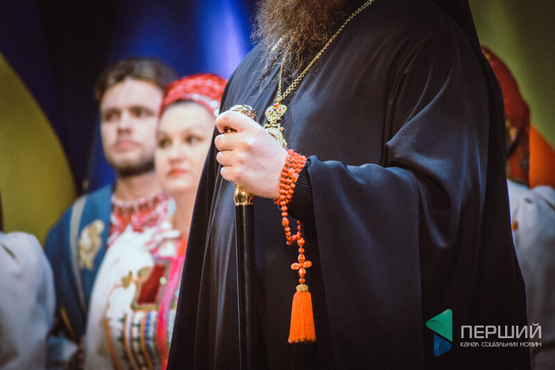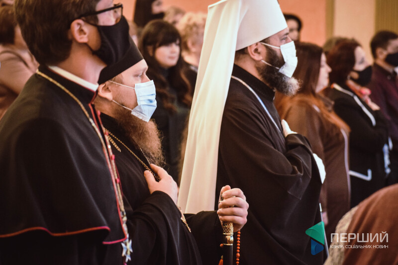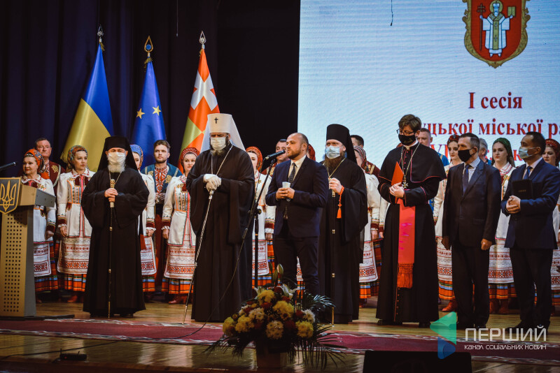 Такого поважного представництва духовенства давненько вже не було на місцевих подіях. Святі отці поправляють маски і піднімаються на сцену. За їхніми спинами на білому екрані великими буквами написано: «Перша сесія Луцької міської ради». Атмосферно.