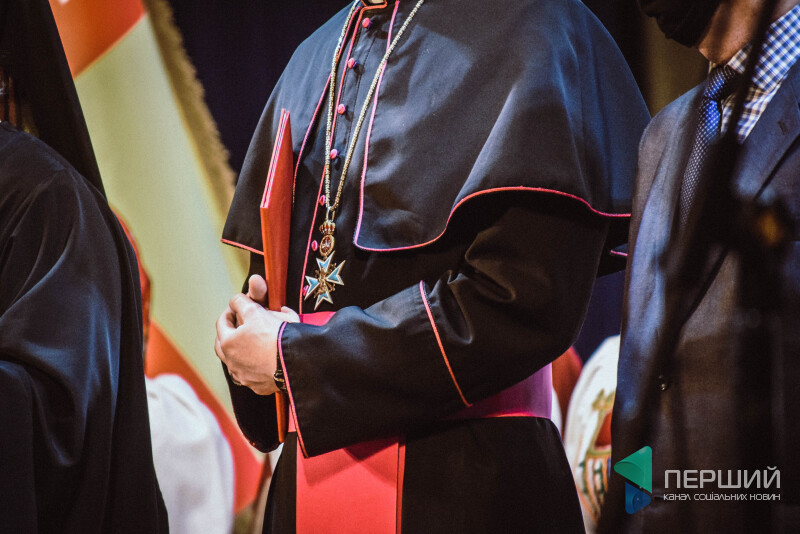 На сцені вервечкою стояли священники і пастори. Один тримав жезла білими рукавичками. Інший - червоні чотки.  Ще інший - чорну і велику Біблію. Хтось - червону папку. І тільки один - просто маску. За їхніми спинами струнко тримав спини хор.