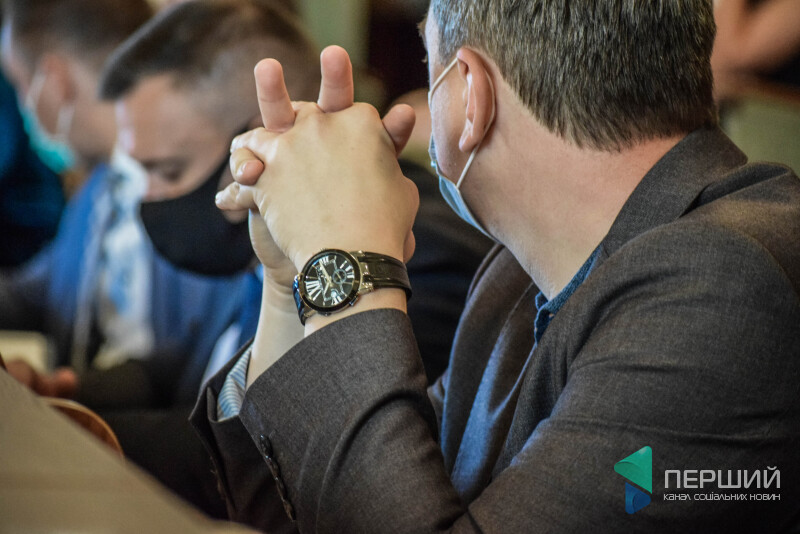 Ірина Вахович та Юрій Погуляйко приходять майже одночасно. На рядах для запрошених займають місця заступники губернатора Олександр Троханенко та керівник апарату Юрій Судаков. Усі троє – в масках. У керівника апарату ради Дмитра Дубняка – рукавиці чорні, маска – теж. Голова облради маску, очевидно, до сукні добирала, у неї – рожева з логотипом Волинської області
