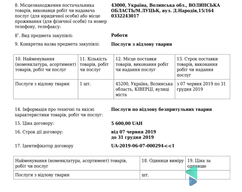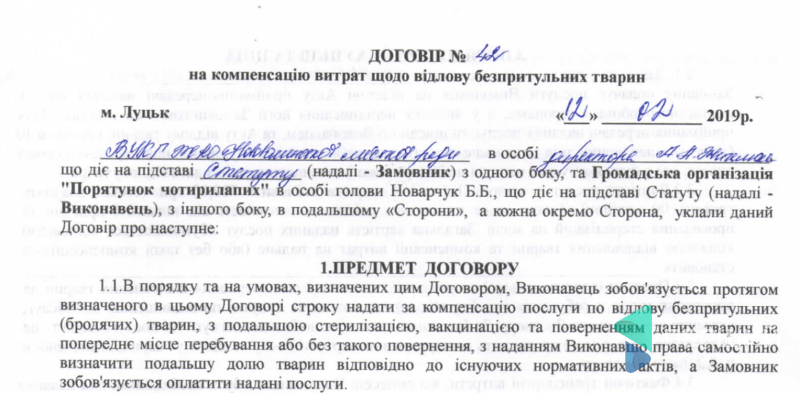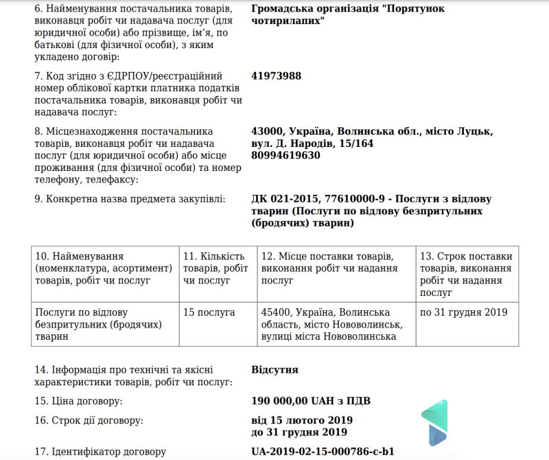 Ще одна угода про відлов, стерилізацію та вакцинацію безпритульних собак – з Нововолинськом. Втім, сума угоди тут значно більша – 195 тисяч гривень. Тут Дана також могла не повертати тварин на місце відлову.