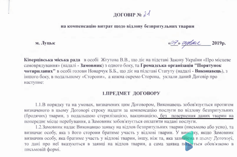 Саме ці організації, за словами зоозахисників, відловлювали тварин в інших містах. Ми знайшли договір, який уклала ГО Дани Новарчук та Ківерцівська міська рада. У ньому йдеться про відлов 8 собак з подальшою вакцинацією та стерилізацією, але БЕЗ повернення їх у місце відлову. Вартість угоди - 5600 гривень.