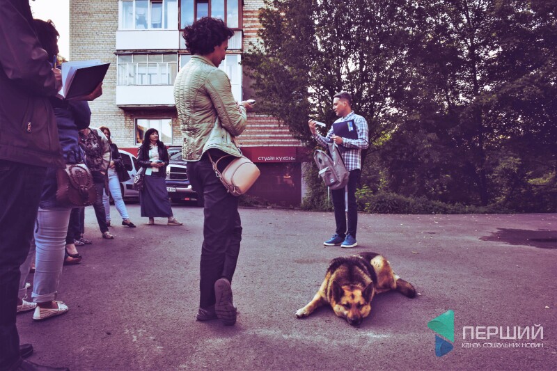 Спиняємося на вулиці Винниченка, у сквері навпроти прокуратури. Увесь цей час за нами слідом йде бездомний пес. Лежить, поки Олександр розказує свої історії і показує фото. Піднімається, як тільки той рушає далі.