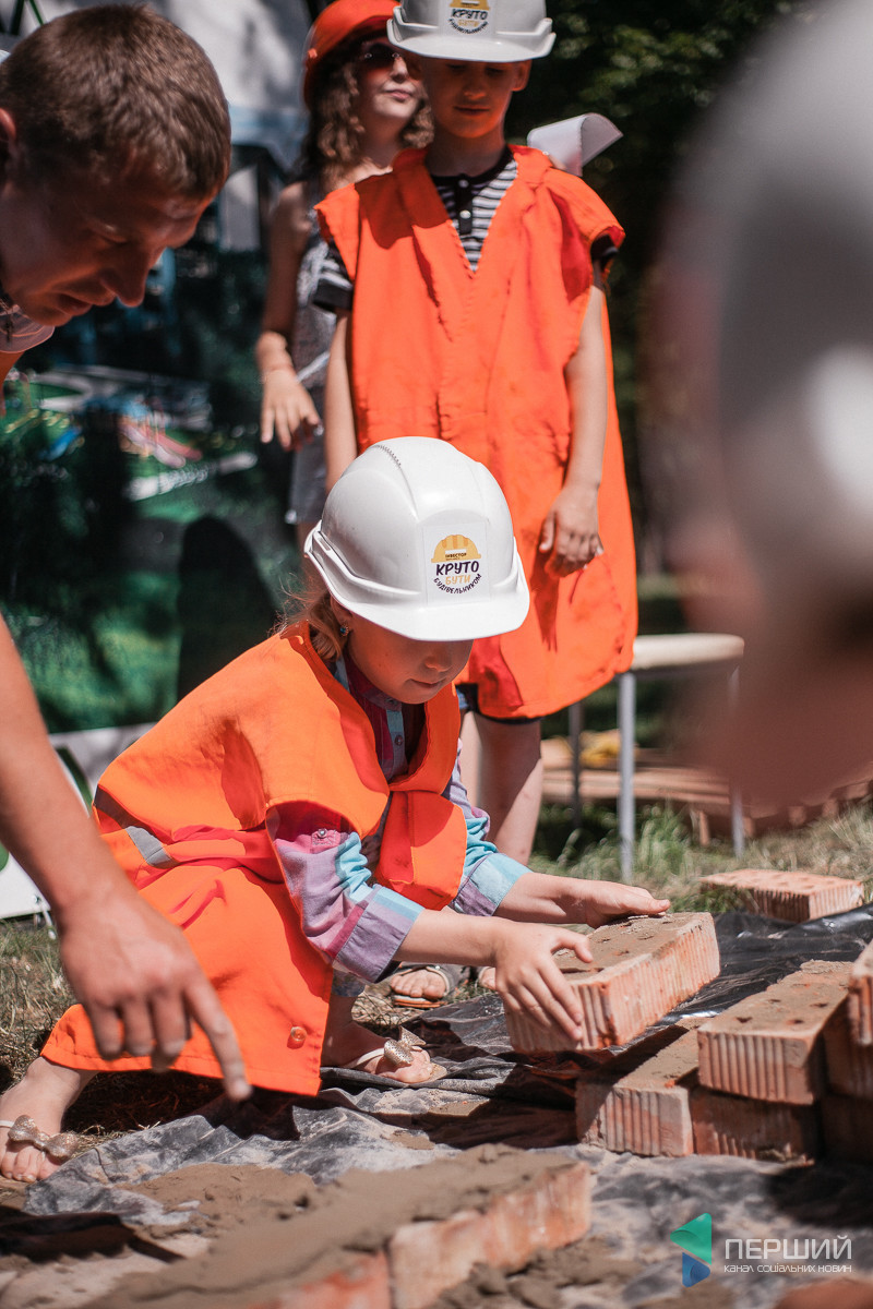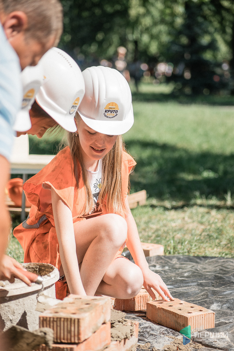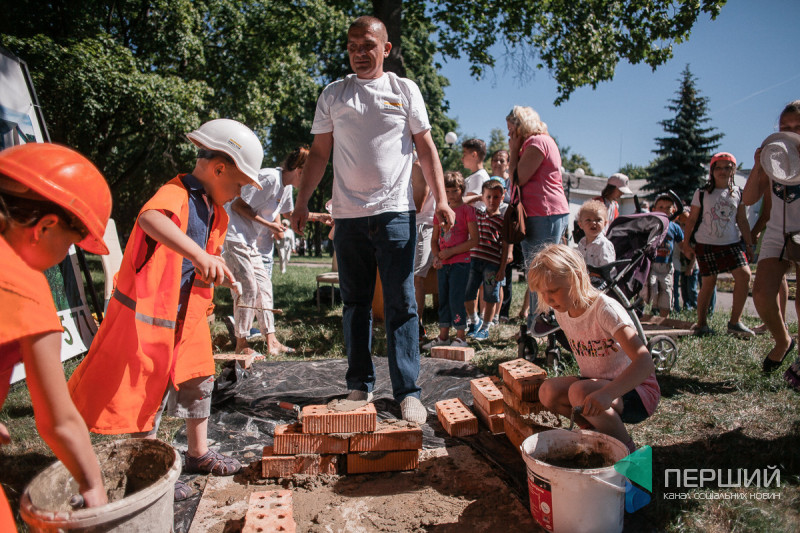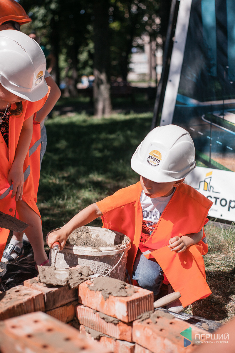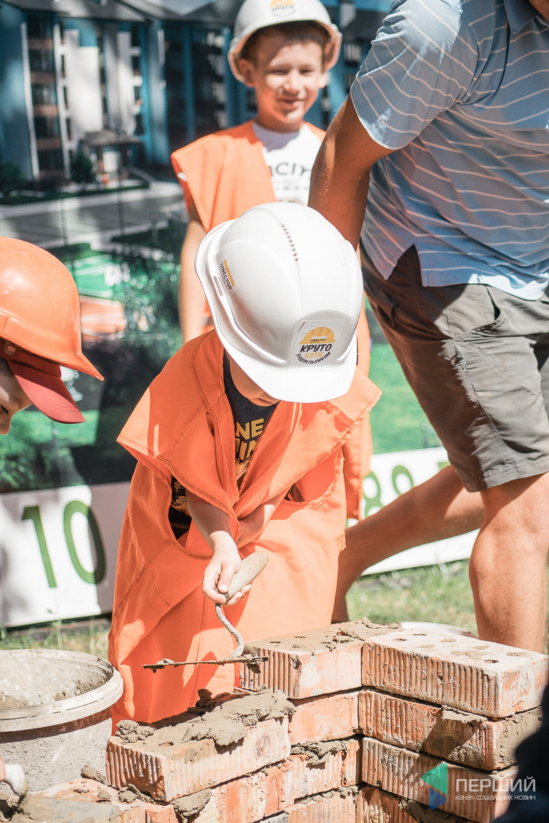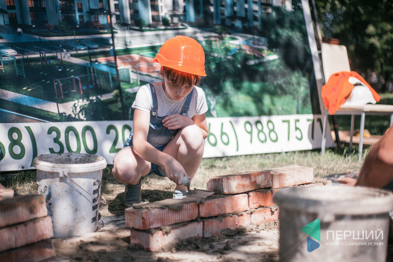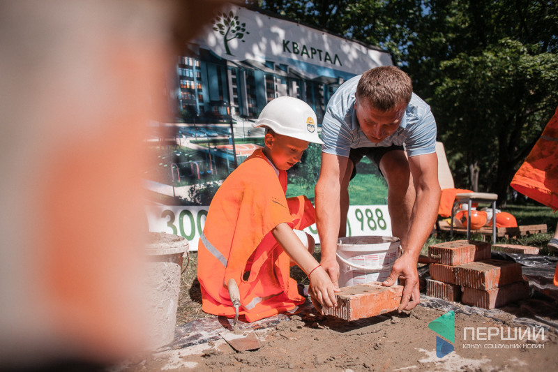 Як із користуватись будівельними інструментами та із цегли та цементу змурувати оселю, дітям показували менеджер з продажу квартир житлового комплексу «Парковий квартал» Будівельної компанії «Інвестор» Ольга Литвак та виконроб будівництва Олександр Поліщук.