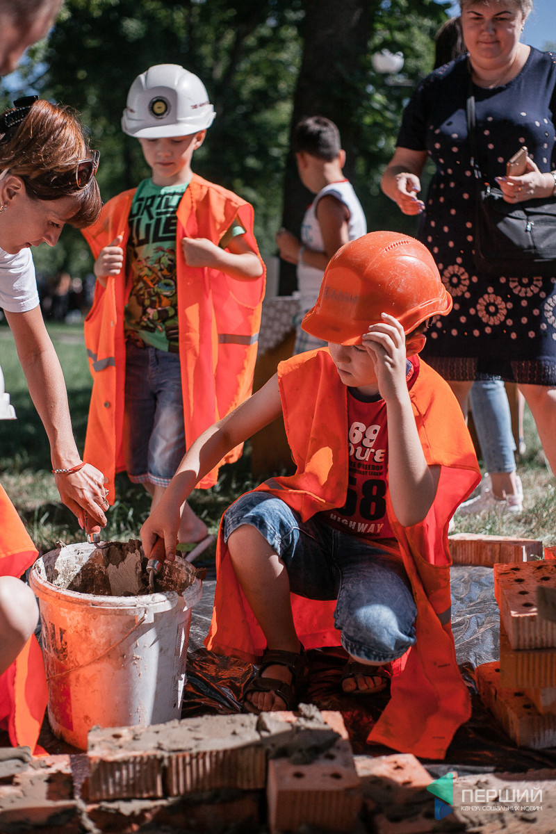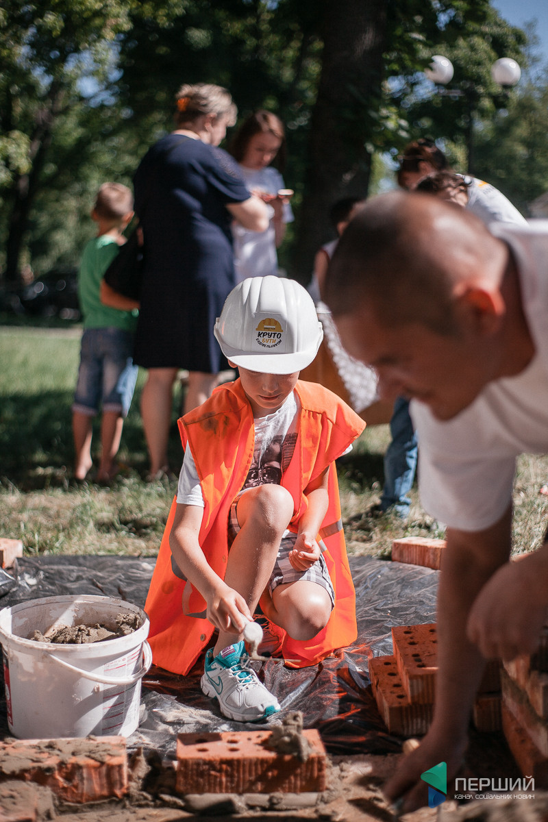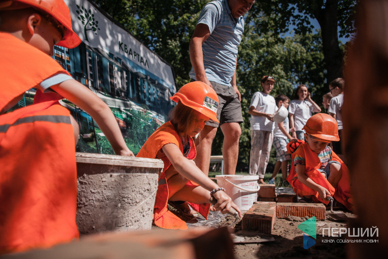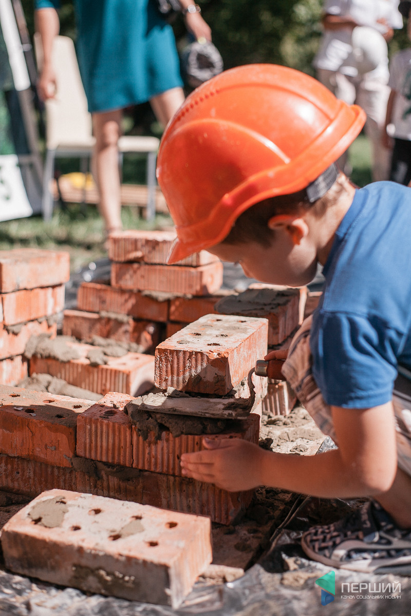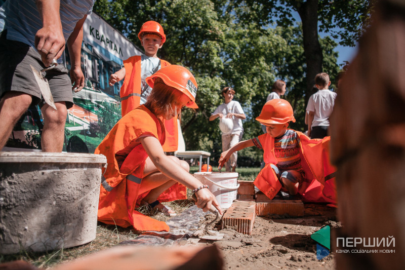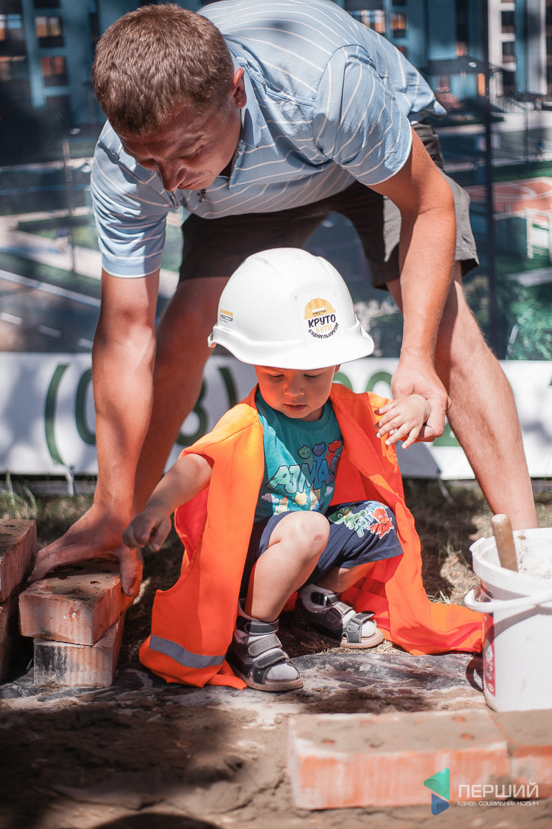Як із користуватись будівельними інструментами та із цегли та цементу змурувати оселю, дітям показували менеджер з продажу квартир житлового комплексу «Парковий квартал» Будівельної компанії «Інвестор» Ольга Литвак та виконроб будівництва Олександр Поліщук.