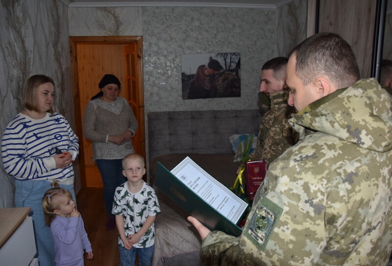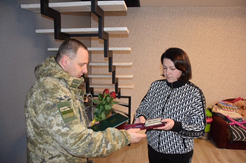 Офіцери загону також побували у селищі Стара Вижівка. Там нині проживає родина старшого майстер-сержанта Олександра Авраменка – військовослужбовця Сумського прикордонного загону. Прикордонники вручили його дружині Юлії медаль чоловіка «За військову службу Україні» (посмертно).
