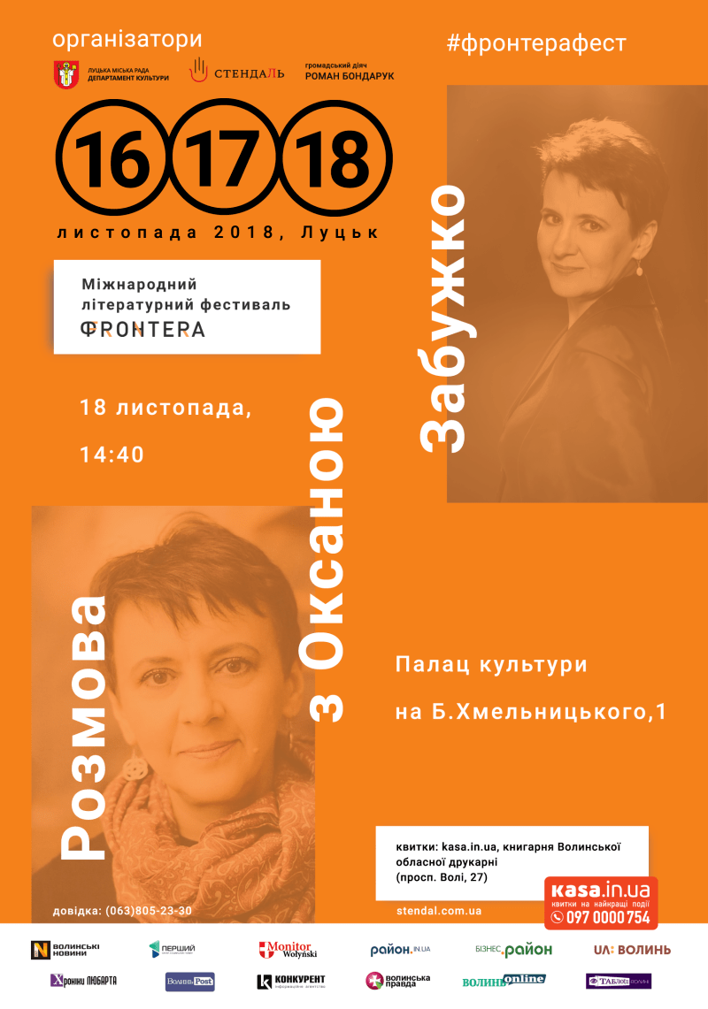 Зустріч і розмова у рамках літературного фестивалю «Фронтера» відбудеться у неділю, 18 листопада о 14:40 у Палаці культури Луцька (вул. Богдана Хмельницького), – пишуть орагіназітори.