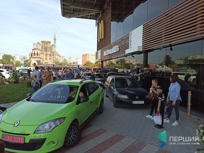 Вервечка автомобілів розтягнулася також перед віконцем МакДрайв. Прийшли сюди й лучани, які не планують відвідувати ресторан, але хотіли подивитись на ажіотаж.