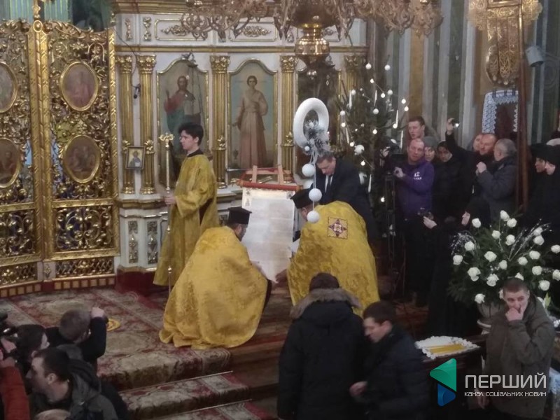 Священики разом з охороною занесли сувій з Томосом, і, нічого не кажучи, поставили його біля вівтаря.