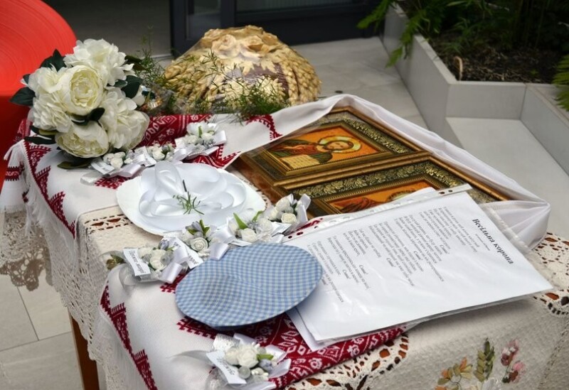 Далі дружки беруть весільну корону, у неї обов'язково має бути вплетена вічнозелена рослина — це чи аспарагус, чи розмарин. Дівчата на тарілці тримають вінець над головою. Дружба нареченого має зачитувати весільний текст урочисто, піднесено. Обов'язково має зробити репетицію, тому що якщо він прочитає негарно, то його в селі можуть цькувати, що не підготувався. Після кожного куплету весільної корони мають музиканти грати весільний туш. Вони мають почути це на подвір'ї. Після того, як він прочитає весільну корону, яка теж лежить на тарілці, то має цю тарілку побити. Якщо з першого разу тарілка не побилась — це не дуже добре, а б'ється вона на щастя. Після того, як він прочитав весільний текст, мама одягає нареченій вінець, підходить наречений, розщіплює її руки, перед тим поцілувавши їх три рази, і одягає їй весільні туфлі. Далі благословляють їх батьки в дорогу", — пояснила Алла Грабар.