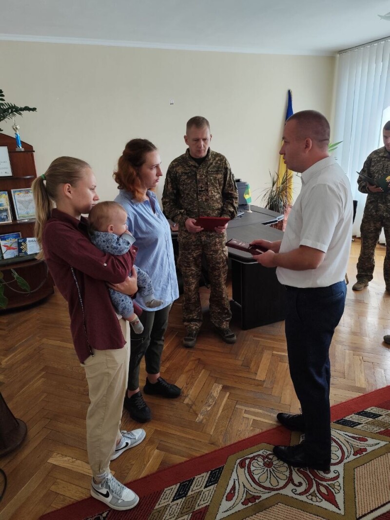 Міський голова Роман Ющук, спільно з представниками Національної гвардії України, почесну відзнаку вручили дружині полеглого воїна – Вікторії та сестрі Анастасії.