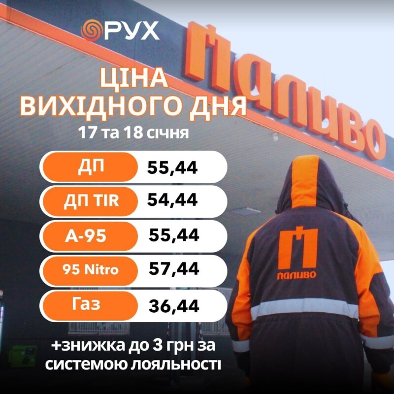 Акційна пропозиція діятиме лише у вихідні 17 та 18 січня на усіх заправних станціях мережі «Паливо» Волині та Рівненщини. Додаткова знижка до 3 грн за системою лояльності!