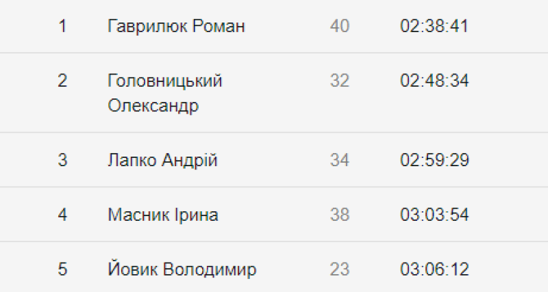 Результати екомарафону «Світанок Світязя» на 42 км:
