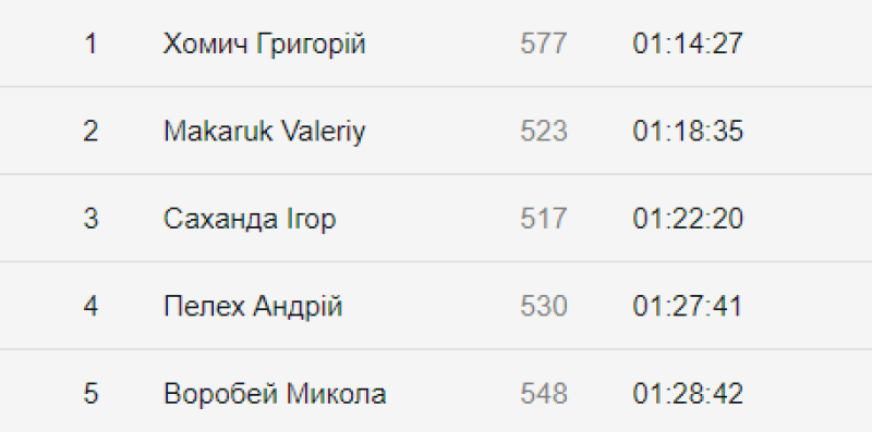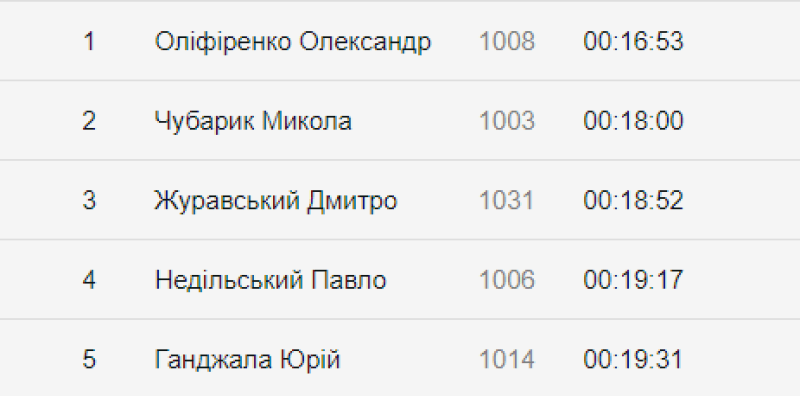 Вже через 16 хвилин після старту на фініші зустріли першого переможця - Олександра Оліференка, який подолав дистанцію 5 кілометрів за 16 хвилин. Отож, результати найкоротшого забігу «ЕКО–RUN» на 5 км: