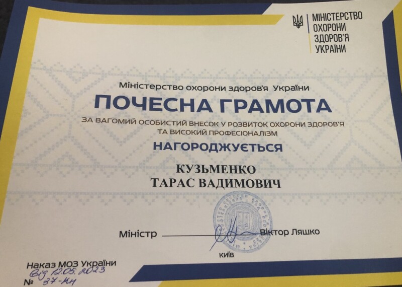 Серед нагороджених Почесну грамоту Міністерства охорони здоров'я України отримав Тарас Кузьменко фельдшер з медицини невідкладних станів комунального підприємства "Волинський обласний центр екстреної медичної допомоги та медицини катастроф" Волинської обласної ради.