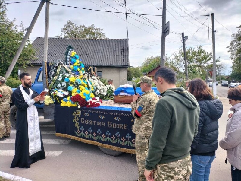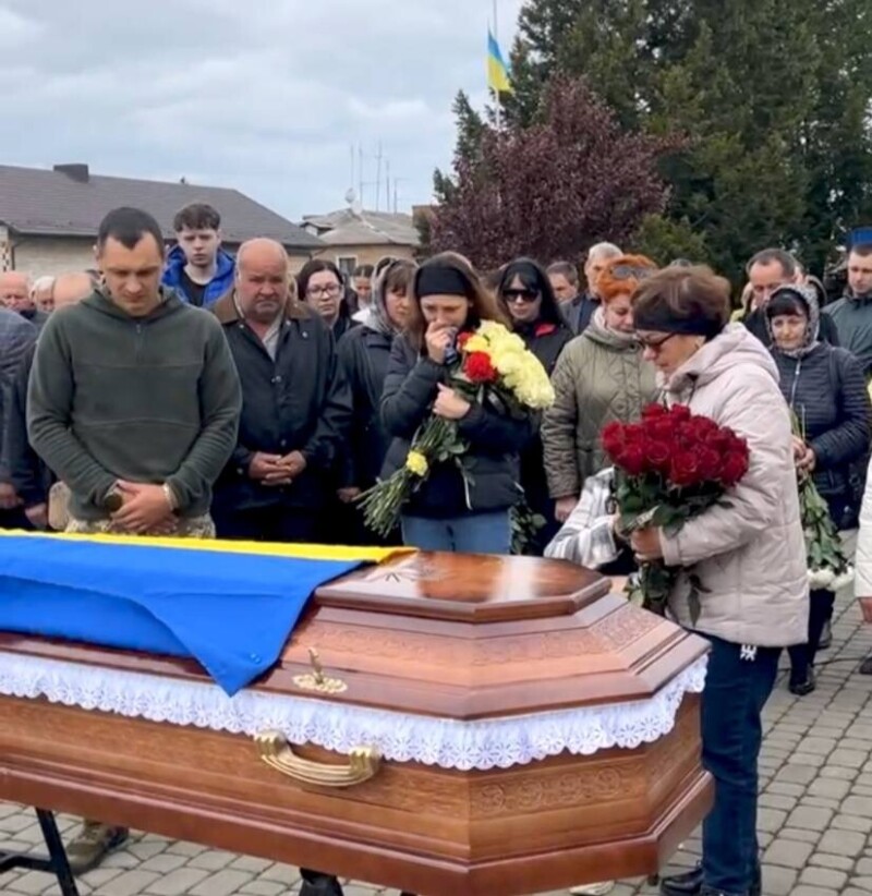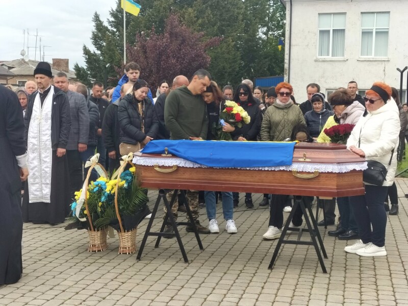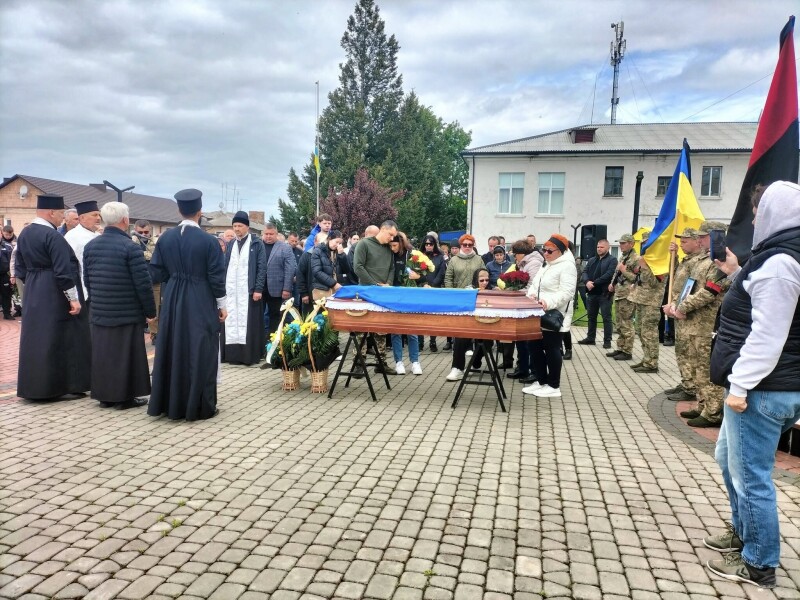 Рідні, друзі, побратими та просто жителі громади прийшли, аби віддати шану та попрощатися з загиблим. Біля пам'ятного знака Борцям за волю та незалежність України відбулася громадська панахида. Круг домовини, вкритої стягом, - сумуюча родина загиблого, сльози та ридання. Востаннє прощається сьогодні з батьком й син, котрий теж боронить українську землю від російської орди.