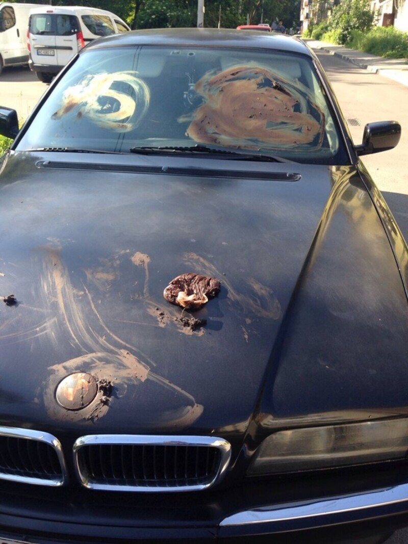 У Луцьку на вулиці Генерала Шухевича невідомі покарали автохама, вимазавши передок його машини BMW лайном. Мешканці зазначають, що цей водій є хамовитим та неодноразово паркується, поршуючи правила.