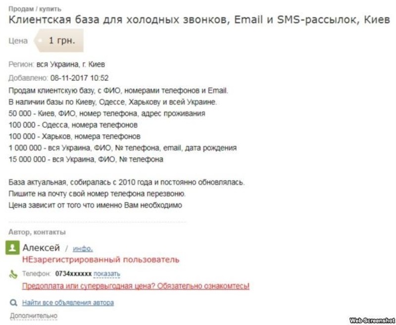 За оголошеннями в інтернеті можна знайти чимало пропозицій щодо можливості придбання клієнтських баз будь-якої тематики. Наприклад, усього 100 гривень коштує список тисячі контактів, у якому, як стверджує автор оголошення, зазначені імена, телефонні номери та місця проживання потенційних клієнтів – громадян з дітьми, котрі є власниками автомобілів чи нерухомості.