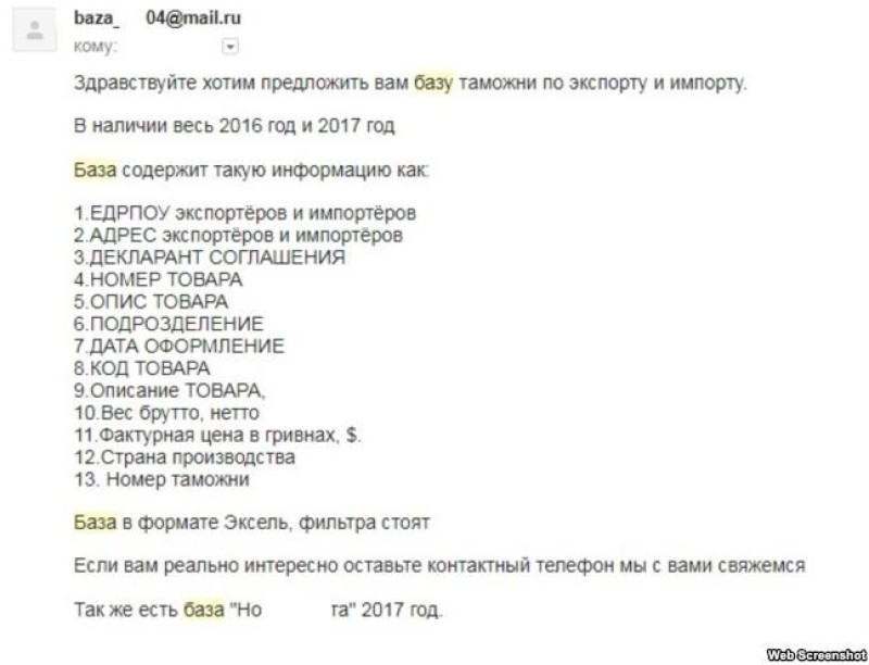 Одним із тих, кому запропонували купити одну з таких баз, був Олександр, який погодився розповісти про свій досвід за умови, що його прізвище і посада не будуть опубліковані в матеріалі. Листа про це він отримав з домену mail.ru на корпоративну скриньку. Жодних контактних даних у цьому повідомленні не було, тож чоловік не знає, хто саме надіслав інформацію.