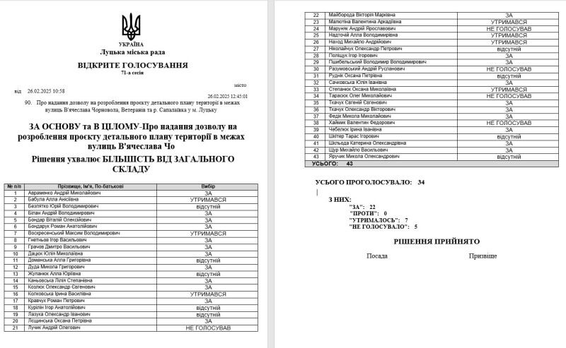 Знову ж таки йде повтор конкретних голосів, які приймали рішення, тобто це безпосередньо приймали рішення фракція «За майбутнє», фракція «Слуга Народу», оскільки вони згадують Рому. Рома – це Бандарук Роман Анатолійович. І фракція Свобода: на той момент були присутні чотири особи. Питання було конкретно у надані дозволу на розробку детального плану території. Воно і було проголосовано.