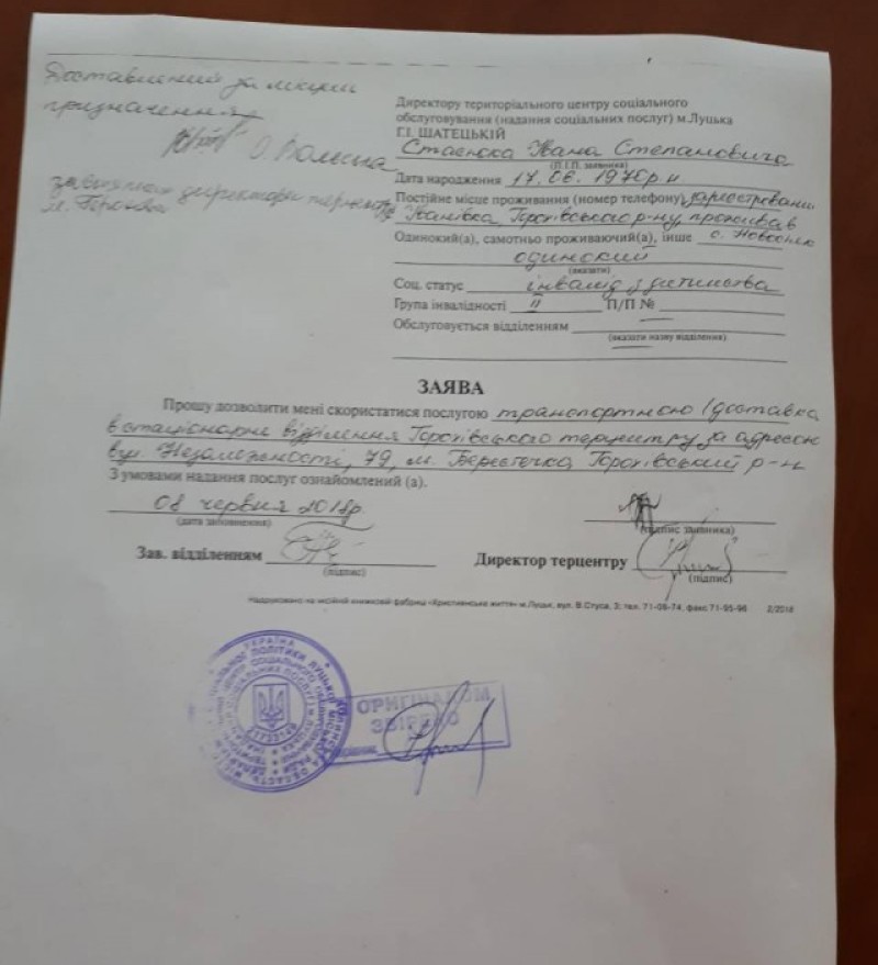 Тоді безхатько Іван Стасюк, який є інвалідом ІІ групи, написав заяву в територіальний центр соціального обслуговування Луцька з проханням транспортної доставки його в стаціонарне відділення Горохівського терцентру, де чоловіку надавали допомогу.