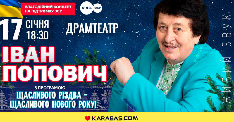 До Різдва і Нового року золотий голос української естради – Іван Попович, готує для лучан справжній сюрприз та запрошує провести різдвяні свята разом! Його концерт відбудеться 17 січня у драмтеатрі. Початок о 18:30.