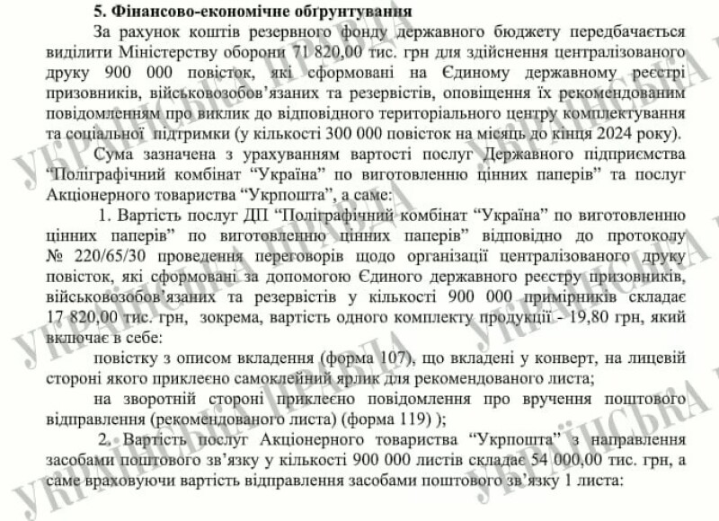 «3 метою зміцнення обороноздатності держави виділити Міністерству оборони 71 820 тис. гривень для проведення централізованого друку повісток про виклик резервіста або військовозобов'язаного до районного (міського) територіального центру комплектування та соціальної підтримки або його відділу, які сформовані за допомогою Єдиного державного реєстру призовників, військовозобов'язаних та резервістів, і направлення зазначених повісток військовозобов'язаним та резервістам засобами поштового зв'язку рекомендованим поштовим відправленням із описом вкладення і повідомленням про вручення», – йдеться у розпорядженні уряду.