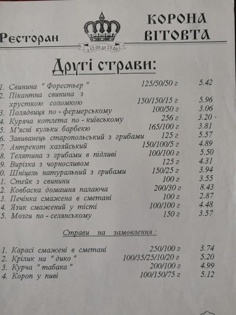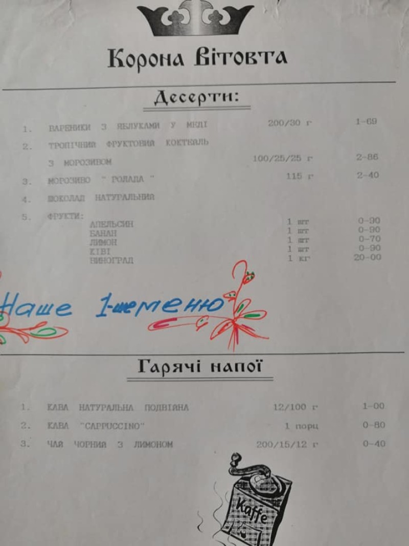 У дописі також розмістили кілька старих фото. Також у мережі оприлюднили перше меню закладу. Каву тоді можна було купити за 1 гривню, чай – за 40 копійок. За стейк зі свинини вагою 100 г тоді платили 3,55 грн, за 125 к вирізки з чорносливом – 4,31.