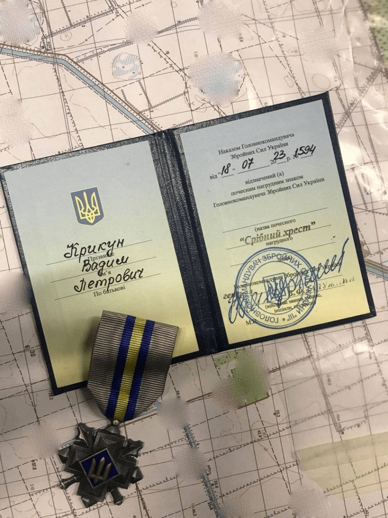 Командир окремого загону спеціального призначення «Любарт» Сил спеціальних операцій ЗСУ Вадим Крикун отримав від Головнокомандувача ЗСУ Валерія Залужного почесний нагрудний знак «Срібний хрест».