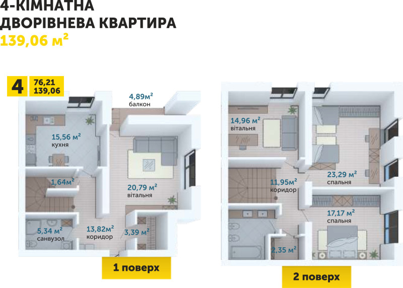 На першому поверсі – тепла підлога. Тут є просторі вітальня та кухня – по 20,79 та 15,56 квадратних метри відповідно. На другому поверсі розташовані три кімнати площею 14, 96, 23, 29 та 17, 17 квадратних метри.