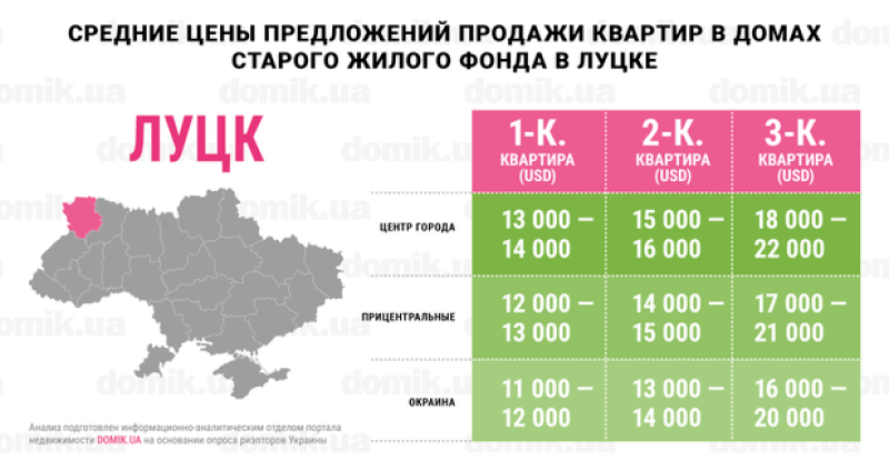 Ціни на квартири в будинках старого житлового фонду Луцька варіюються від 13000 до 20000 доларів.